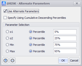 Many distribution functions can utilize an alternate set of parameters; for example, a Normal distribution function uses a mean and standard deviation as the standard parameters, but can use percentile values for the left and right thresholds instead. Generally, Alternate Parameters allow for the use of percentiles as parameters for the distribution as opposed to the standard arguments.