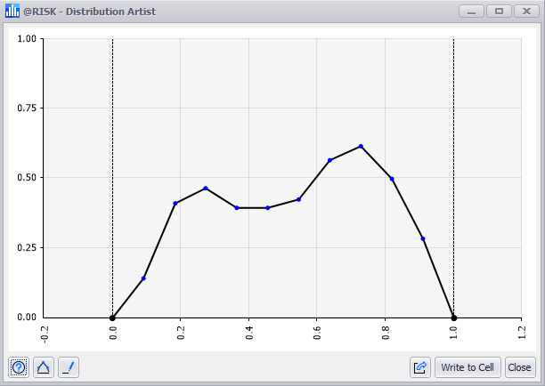 If the selected cell has a distribution function that was created through another @RISK process (e.g. Define Distribution or Distribution Fitting), the Distribution Artist window will open displaying a graph of the selected distribution function. The probability can be edited from this window and written to a new cell; see Modifying Distributions.