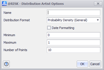 When creating a new probability distribution through the Distribution Artist, the first window that will open is the Distribution Artist Options window. From this window the details of the new distribution can be configured, including:
