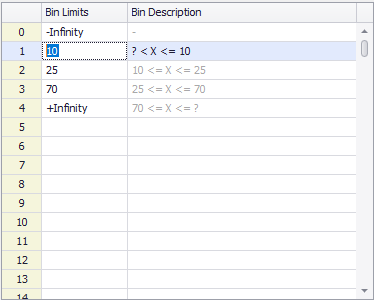 Similar to Equal Interval bins, the first and last bins can be configured to extend to minus and plus infinity when working with a data set with unknown bounds. For example, Figure 2 illustrates a bin configuration where the first bin extends from 'minus infinity to less than 10', and the last bin extends from 'greater than or equal to 70 to plus infinity'.