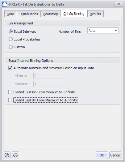 The Chi-Sq Binning tab of the Fit Distributions to Data window (Figure 1, right) includes the configuration options for chi-square tests that are run during the fitting process. The tab includes two sections: