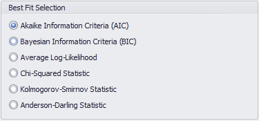 The fitting process generates goodness-of-fit statistics for each distribution tested, using several different methods for ranking how well a distribution (and its estimated parameters) fits to the selected data set. The Best Fit Selection configuration (Figure 1, right) determines which ranking method will initial display in the Fit Results, but the statistics for all methods are generated during the fitting process.