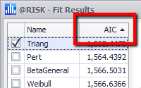 The ranking used by @RISK to recommend the Best Fit distribution is initially selected in the Results tab of the Fit Distributions to Data window; however, the ranking method can be changed after the fitting process has run. The ranking method currently active in the Fit Results window will be displayed in the column header of the distribution list (Figure 2, right).