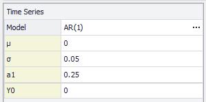 • Time Series - Primary settings for the time series model function (Figure 1, right); these include the model being used and the parameter values, e.g. mean (µ), volatility (σ), autoregressive coefficient (a1), and initial value (Y0) for an AR(1) time series model (Figure 1, right).