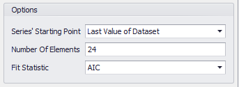 • Number of Elements - Only available when 'Series Starting Point' is set to 'Last Value of Dataset'. The number of data points (representing time periods) that will be included in the resulting time series model tested in the fitting process.