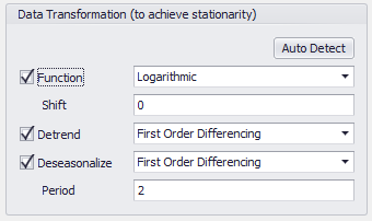 The three primary transformation configurations are Function, Detrend, and Deseasonalize; checking the box next to an option will enable it. Activating the Function option will enable adding a Shift, and activating Deseasonalize will enable adding a Period. The full options, with the associated choices are: