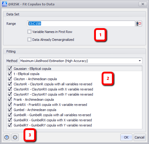 The fitting process uses the selected data set and tests all copula types that have been selected for fitting against the data. The method for determining how well a copula fits to the data can also be selected.