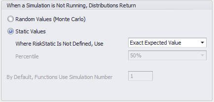 These options (Figure 3, right) control what is displayed in a worksheet when a simulation is not running; by default, @RISK Is configured to display static values in cells that contain distribution functions. However, the nature of the static value can be configured, or the workbook can be configured to show random values for each distribution function (as in, a sample value that would be returned by that distribution function).