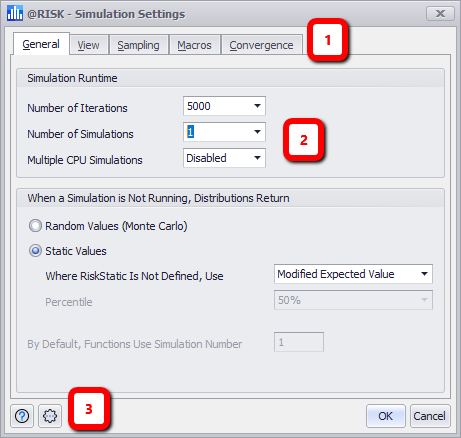 The General tab of the Simulation Settings window contains the overall settings for a simulation run of the current model; this includes the number of iterations to use for each simulation that is executed, the number of simulations to execute in a single run, and what values to display in the Excel worksheet when a simulation is not running. Iterations and simulations work together to produce sample values for all distribution functions included in the model, potentially using different input parameters for each simulation.