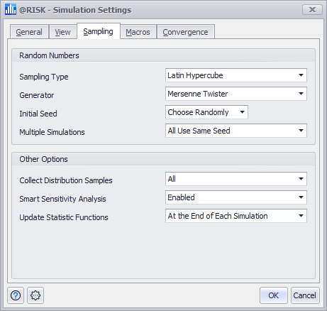 The 'Other Options' settings determine how (or if) @RISK collects and stores distribution sample values, among other settings related to distribution samples. Collection of distribution sample values and their statistics aids in analysis through Simulation Sensitivities and Simulation Scenarios by preserving the values upon which various other statistics can be generated. Additionally, saved sample values can be viewed in the Simulation Data window (e.g. for debugging purposes).