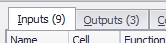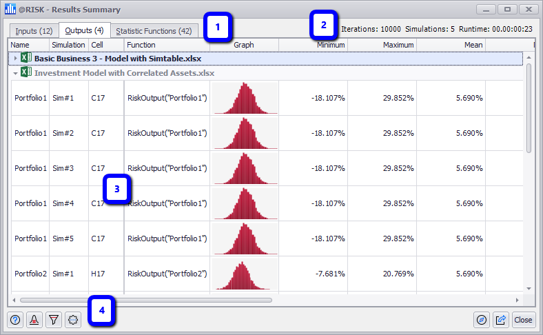 The @RISK elements included in the results are categorized into three tabs for display in the Results Summary window. The tab displays both the category name - Inputs, Outputs, and Statistic Functions - as well as the number of elements (Figure 2, right) included in that tab. The Category Tabs and their contents are: