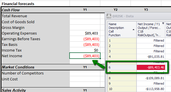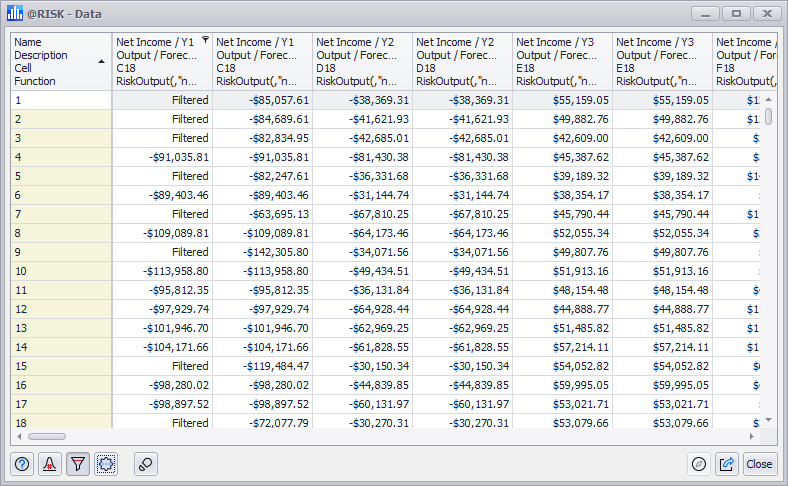 The Data window (Figure 2, right) contains all of the sample values for the entire simulation run. Each element is a column; if multiple simulations were executed during the simulation run, each element will be included for every simulation in its own column. Every iteration in the simulation run is a row.