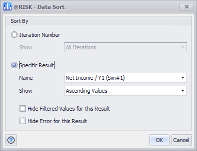 By default, the Data window is sorted ascending by iteration number. However, the data can be sorted by any element by using the Sort Data command; selecting this option from the Settings/Actions button will open the Data Sort window (Figure 3, right). The Data Sort window comtains the following configurations: