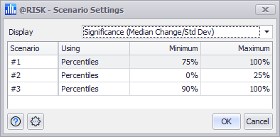 @RISK allows for three scenarios to be defined. These scenarios can be modified using the Scenario Settings command from the Settings/Actions menu (see below).