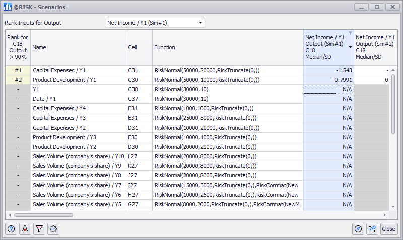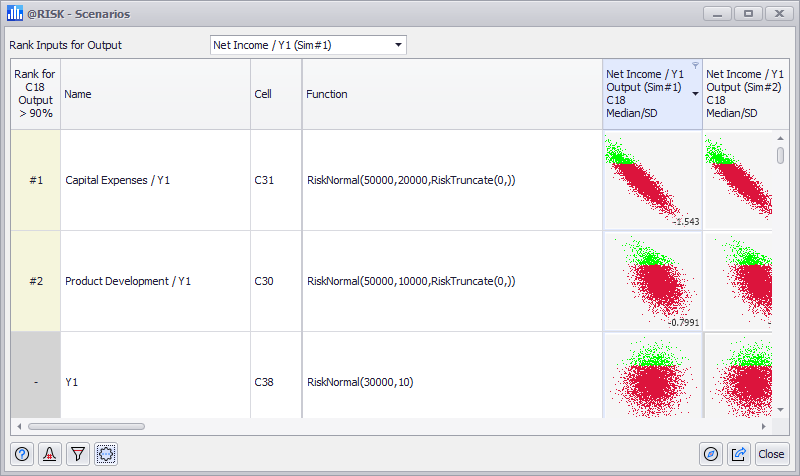 The Scenario command in the Explore Menu opens the Scenario window (Figure 1, right) which displays scenario analysis results for outputs in an @RISK model. Scenario analysis helps in identifying which input variables contribute significantly towards reaching a specific outcome for the selected output; the Scenarios window shows a ranked list of the inputs that had a measurable effect on the output given the scenario selected in the Settings/Actions menu.