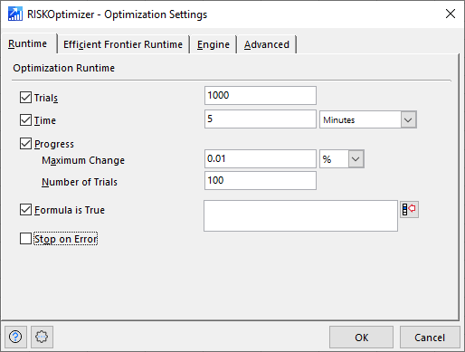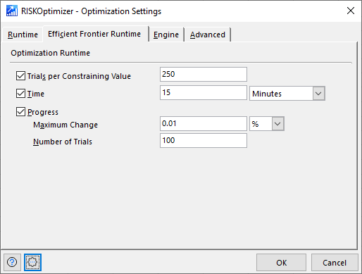 The Efficient Frontier Runtime tab (Figure 2, right) contains settings that control how and when RISKOptimizer will stop an Efficient Frontier optimization. Standard optimizations are controlled by the Runtime tab, above.