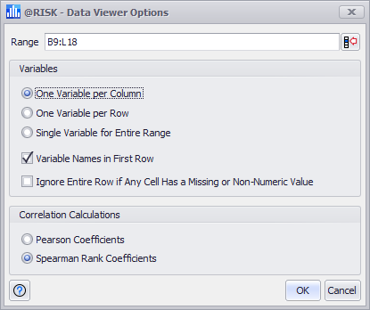 To use the Data Viewer, select a range of data and click the top half of the Data button in the @RISK ribbon; alternately expand the Data menu and select 'Data Viewer'. The Data Viewer Options window (Figure 1, right) will open and the properties of the data set can be specified.