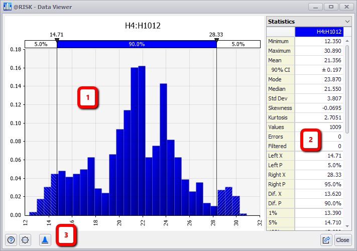 Using the Data Viewer on a single variable, or dragging and dropping a single variable from the Multivariate Data Viewer window, displays a simple graph window for a single variable (Figure 1, below). This window shows the distribution of the variable’s data, and the same options for manipulating the graph’s display as other @RISK graph windows.