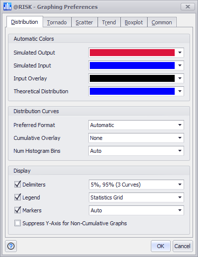 Each graph type has one or more 'Automatic Colors' associated with it. These indicate what color should be used for a graph curve, assuming that curve’s formatting has been left in its automatic mode. Additionally, there are other options associated with each graph type - for example, the 'Preferred Format' option in the Distribution tab determines if distributions should be displayed in a Probability Density format, a Cumulative Ascending format, etc.