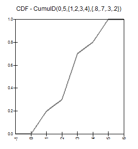 RiskCumulD(0,10,{1,5,9},{0.9,0.3,0.1}) returns a cumulative curve with 3 data points and a range of 0 to 10. The first point on the curve is 1 with a cumulative descending probability of 0.9 (10% of the distribution values are less than or equal to 1, 90% are greater). The second point on the curve is 5 with a cumulative descending probability 0.3 (70% of the distribution values are less than or equal to 5, 30% are greater). The third point on the curve is 9 with a cumulative descending probability of 0.1 (90% of the distribution values are less than or equal to 9, 10% are greater).