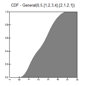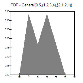 RiskGeneral(0,10,{2,5,7,9},{1,2,3,1}) returns a general probability distribution density function with four points.  The distribution ranges from 0 to 10 with the height of the curve specified at the values 2, 5, 7, and 9.  The relative heights of the curve at these values are 1, 2, 3, and 1.  The curve intersects the X-axis at 0 and 10.