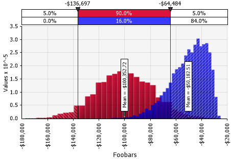 Two vertical delimiters are available on distribution graphs. By default, the delimiters are placed at the 5th and 95th percentiles (Figure 1, right). By dragging the delimiters, target probabilities or percentiles can be computed and displayed. This is useful for graphically displaying answers to questions such as 'What is the probability of a result between one million and two million occurring?' or 'What is the probability of a negative result occurring?'.
