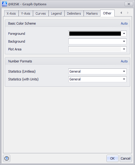 The Basic Color Scheme group provides options for controlling the foreground, background, and plot area colors of the graph. Unclick the Auto button in the upper right corner to override the default options.