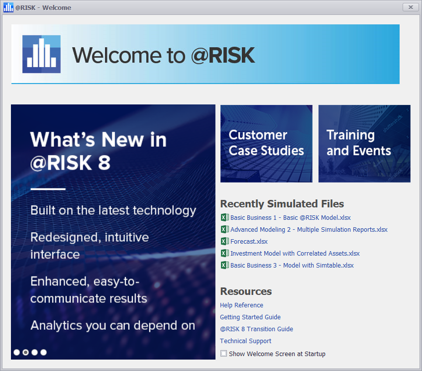 The first time @RISK is started, the Welcome screen will open. The Welcome screen can also be opened manually from the @RISK Menu. The Welcome screen includes up-to-date news and announcements as well as several key shortcuts.