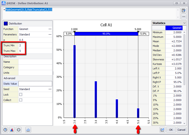 There are three ways to specify a truncation - two methods using values and a third method using percentiles. Each option corresponds to a different @RISK property function inserted in the distribution function.