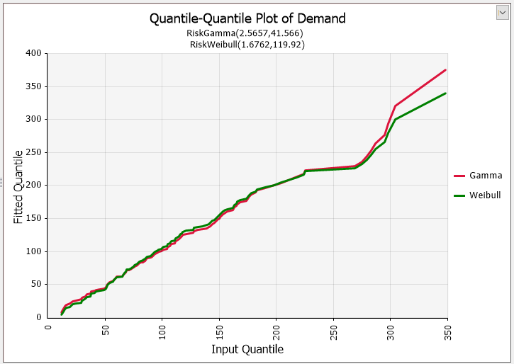 Similar to a Probability-Probability Plot, a Quantile-Quantile Plot (or Q-Q Plot, Figure 3, right) compares the data set (X-axis) to the fitted distribution or distributions (Y-axis); and as with the P-P Plot, the closer a Q-Q Plot's graph is to linear (where x=y), the better the fit of the fitted distribution. However unlike the P-P Plot, this comparison uses the quantiles of each distribution.