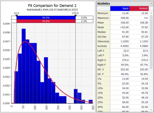 The Fit Comparison Graph (Figure 1, right) displays two curves when the Fit Results first opens - the distribution of the sample data and the best fit distribution as an overlay (based on the ranking method chosen - see Fit Ranking Methods). Additionally, the @RISK function (or functions) displayed in the comparison are detailed beneath the graph title, including the parameters. Lastly, the statistics for both the same data and the selected distribution are displayed in the Information Panel to the right of the graph.