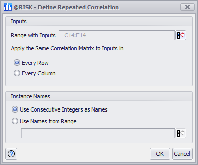 When multiple sets of related inputs should be correlated using the same correlation matrix (e.g. a set of multiple inputs that are created to span several years), the Define Repeated Correlation command can be used to create a single correlation matrix and apply it to multiple instances at the same time.