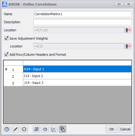 Working with inputs and rows through the Edit Correlation button functions very similar to the other views of the Define Correlations window. The Append, Remove, and Replace commands are nearly identical within the following guidelines: