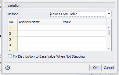 Certain variation methods can have analysis names manually assigned. The variation methods that can include named analyses are Values from Table and Values from Excel Range.