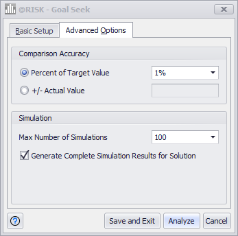 The Goal Seek analysis can be configured further by clicking the Advanced Options tab at the top of the window; this will switch to the Goal Seek Options window (Figure 2, right), where the following configurations are available: