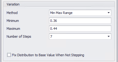The first and the last value in the sequence to step through are obtained by incrementing, or decrementing, the input's Base Value (set in the input's configuration - see Advanced Sensitivity Analysis). The Base Value is modified by the percentages specified in Min Change (%) and Max Change (%) entries. The intermediate values are at equal intervals, with the number of values to test set by Number of Steps.
