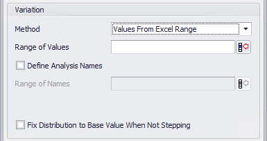 The sequence of values to step through is found in a range of worksheet cells in an Excel workbook. Optionally, check the Define Analysis Names box and select a range of cells in the Range of Names field to define step names.