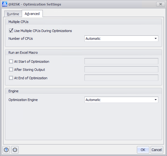The Advanced tab (Figure 3, right) contains options to control how multiple CPUs are used during optimatization, as well as for specifying macros that run as part of an optimization and the selection of the optimization engine.
