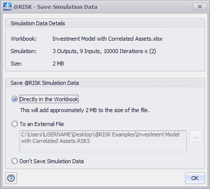 @RISK simulation data can be stored in two places. For data that is not too large, storing @RISK data directly in a workbook is the most convenient option. That data is then tied directly to the model and will automatically beopened in @RISK when the model workbook is opened. However, if the data is too large, or in scenarios where multiple sets of results need to be stored, simulation results can instead be stored in an external file, with the extension .RSK5. (This file format was first introduced in @RISK version 5.0, which gives it its name.)
