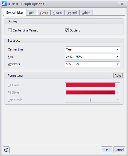 The Formatting section configures the color and styling of the boxes and the outlier data points (if they are displayed). Unclick the Auto button in the upper right corner to override the formatting options.