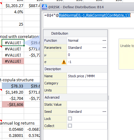 Any @RISK statistic functions that have errors due to incorrect inputs are labeled with a warning icon, but no error details are available.